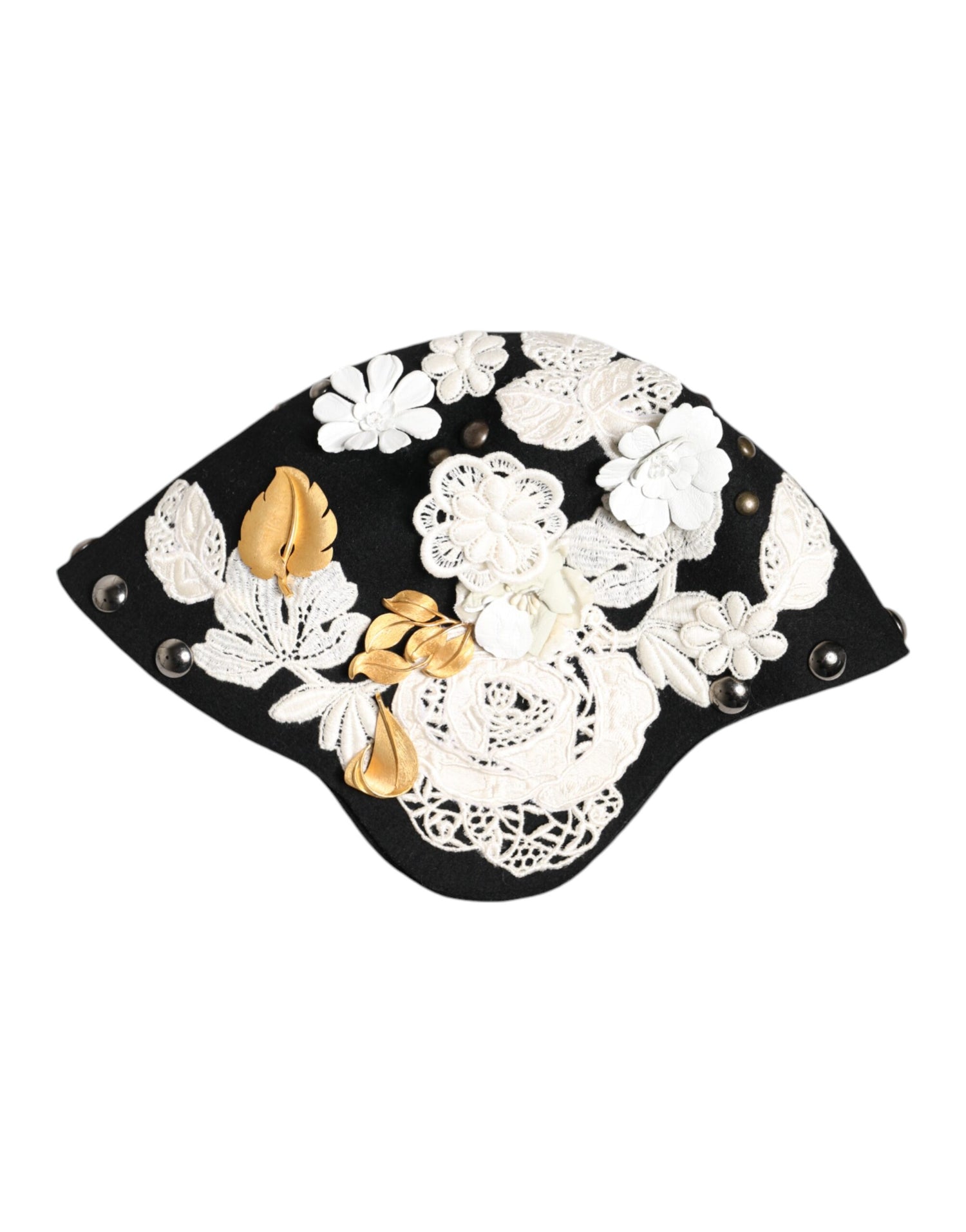 Dolce & Gabbana Black Wool White Floral Gold Leaf Cloche Hat
