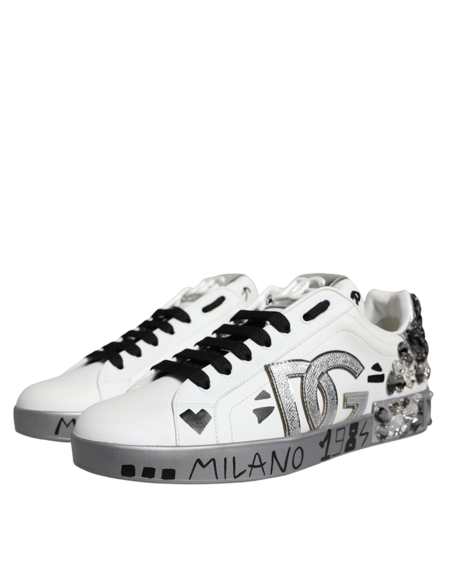 Dolce & Gabbana White Silver Crystal Logo Portofino Sneakers Shoes