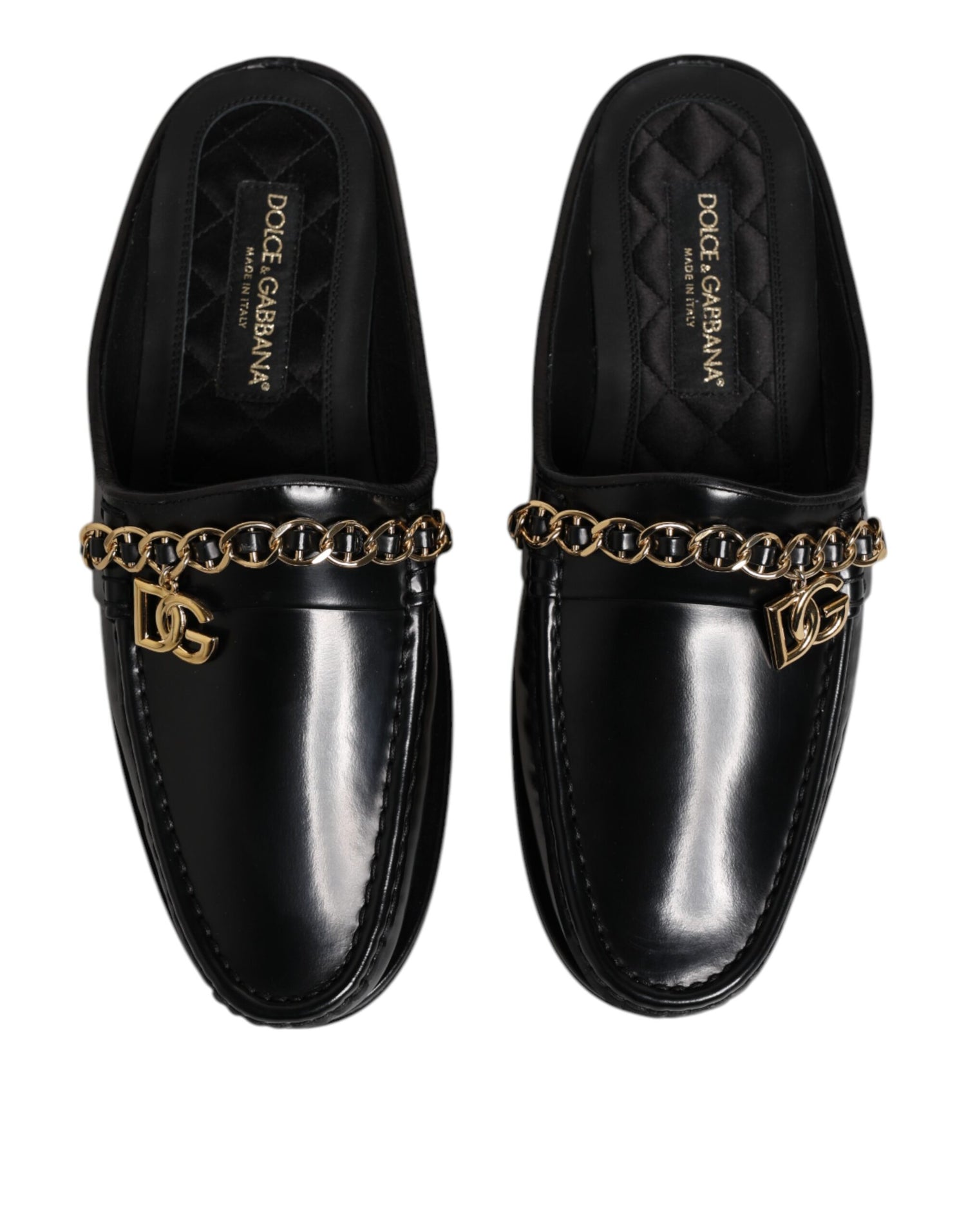 Gorgeous brand new, 100% Authentic Dolce & Gabbana slip on open-back shoes come in calfskin upper with a gold tone chain GD logo band.