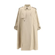 Saint Laurent’s cotton twill Trench Coat reinterprets the classic silhouette with textured details and military elegance. Made of certified cotton, it features a cape design with a pointed collar and adjustable chin strap, windproof flap, padded shoulders and straps on the cuffs. The front button and hook-and-eye closure at the collar, along with the two profiled pockets, complete a refined and functional garment.