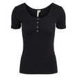 Classic black buttoned T shirt for women Short sleeves and round neckline Made of 95% cotton and 5% elastane for comfort Versatile and timeless design Machine washable at 30° 95% cotton -5% elastane Size on Tag: XL