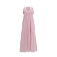 The Vasma strappy Dress by Marant Etoile is crafted from lightweight organic cotton voile, designed to move effortlessly with the body. The long, flared silhouette is enhanced by a V-neckline at the front and a halterneck cut at the back with thin straps, subtly revealing the shoulders and back. Ruffled details with crochet edging and ladder-stitch inserts add a refined artisanal touch. Fully lined for comfort, the dress is finished with an asymmetric hem that brings fluidity and movement to the design.