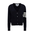 Thom Browne Cardigan made of soft merino wool, featuring a monochrome design and slim fit. Featuring a V-neck with ribbed trim, it has a front button closure and two patch pockets on the front. The brand’s iconic horizontal bands decorate the left arm, adding a distinctive touch. Slight adjustable side slits with buttons complete the garment, for greater freedom of movement. A refined and versatile garment, perfect for smart or casual looks.