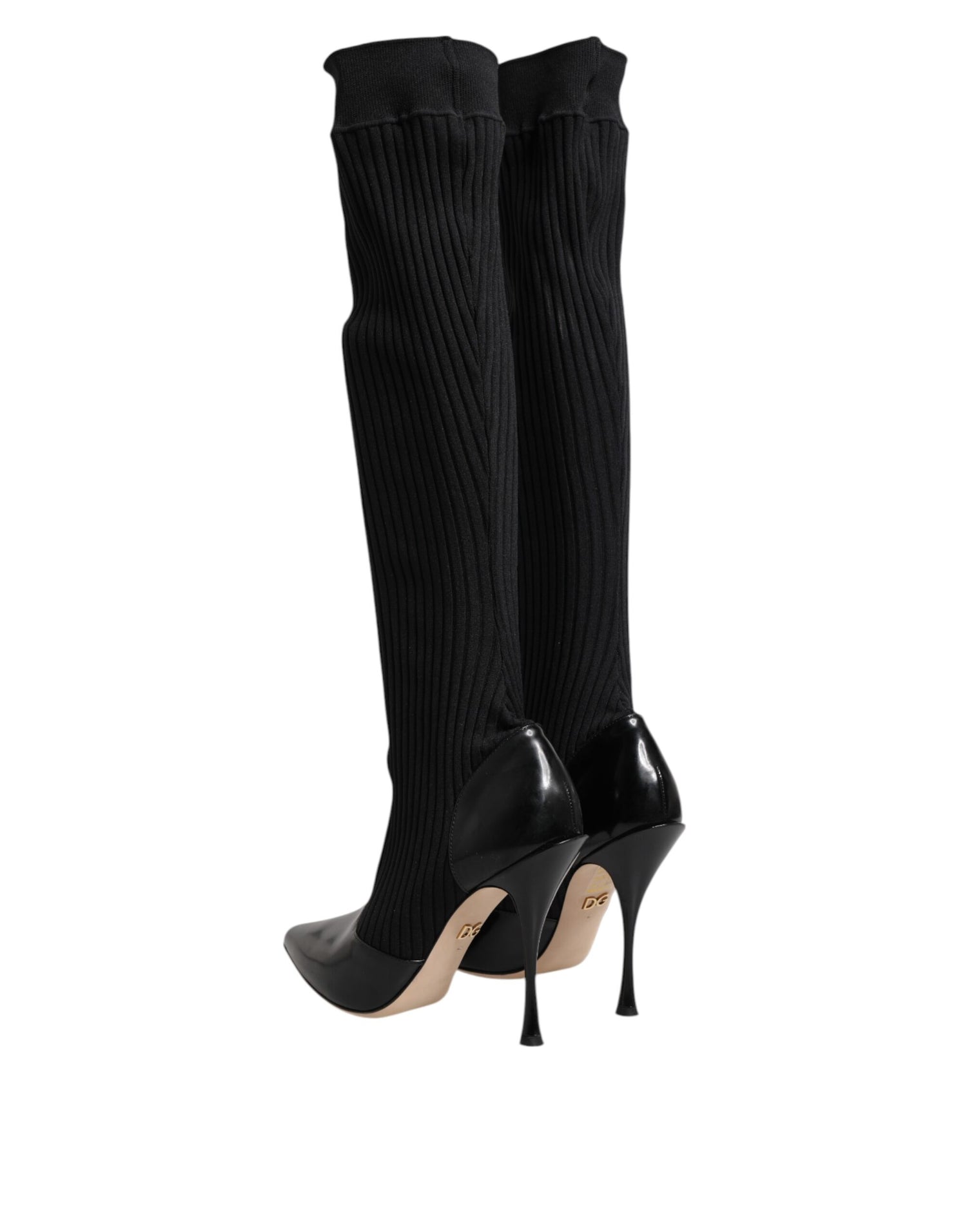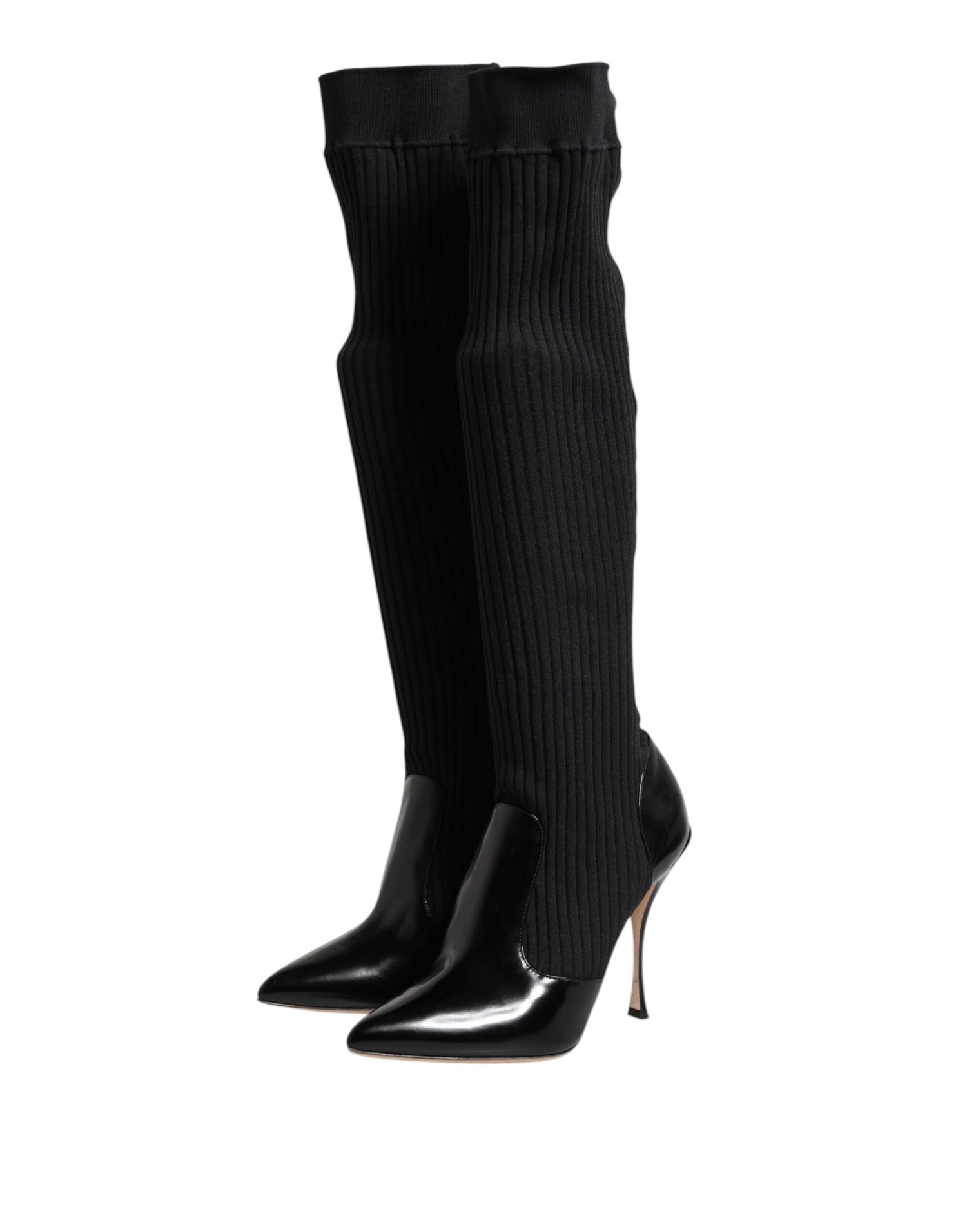 Dolce & Gabbana Black Leather Ribbed Knit Knee Boots Shoes