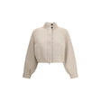 The Cashmere Cardigan by Brunello Cucinelli features a combined button and zipper closure, long sleeves with buttoned cuffs, and two welt pockets at the front, combining functionality with contemporary style.