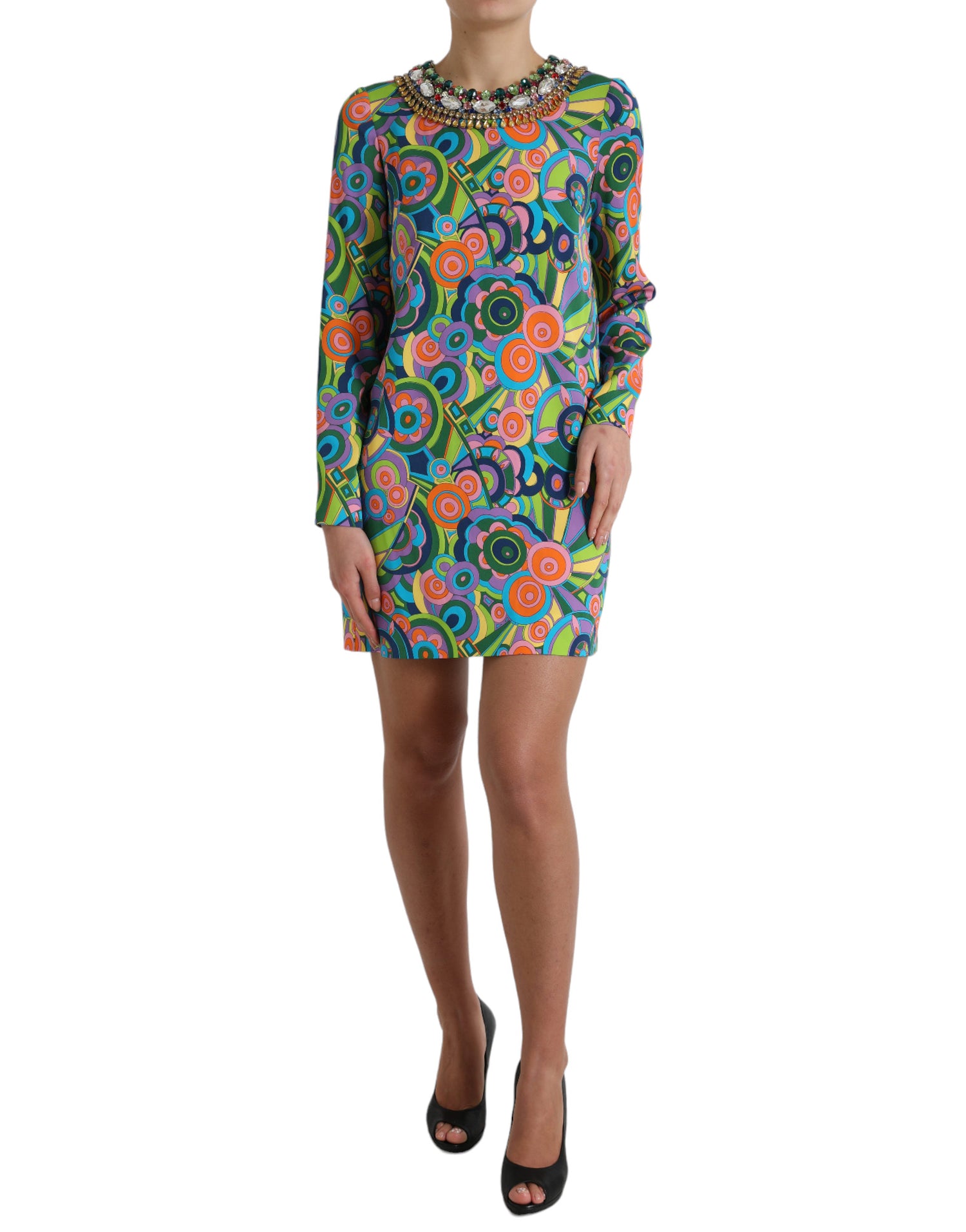 Dolce & Gabbana Multicolor Geometric Print Silk Crystals Midi Dress