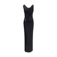 The sleeveless jersey Dress by Versace is a draped design that elegantly enhances the silhouette. Featuring a soft neckline, it is embellished with iconic details: golden logo pins applied on the front and shoulder, recalling the Maison’s bold and sophisticated aesthetic.