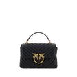 The Calfskin Love Lady Mini Handbag by Pinko, front magnetic flap closure, iconic gold-plated Love Birds logo embossed on the front, quilted and padded design, double interior compartment, removable chain shoulder strap with smooth leather insert, flat rigid top handle, interior flat pocket with zipper, iconic tone-on-tone embroidered brand monogram on the back.