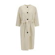 Long Coat by Aftercoat features a classic crew neck that lends an elegant, understated look. The front button closure adds a touch of sophistication, while the matching knotted sash at the waist allows you to customize the fit, creating a defined silhouette. The two side welt pockets add functionality without compromising the clean aesthetic of the design.