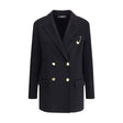 The Double-breasted Coat in wool and cashmere blend by Versace combines sartorial elegance with iconic details. The notched lapel, long sleeves, and front patch pockets enhance the coat’s classic lines, while the Safety Pin accessory and Medusa buttons add a distinctive character. Buttoned cuffs and the rear vent complete the design, perfectly balancing style and functionality.