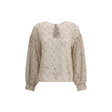 Kristina Ti’s silk blouse expresses delicate femininity through a refined floral print. The wide sleeves lend lightness to the design, while the button closure at the neck adds a discreet and sophisticated detail.
