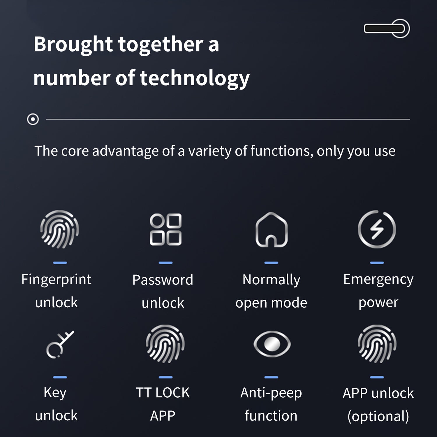 Unlocking method: password+fingerprint+keys; password+fingerprint+Bluetooth-Cmpatible app (TT lock)