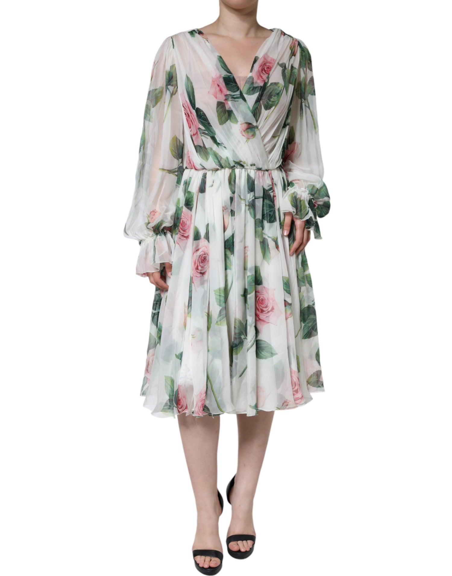 Dolce & Gabbana White Silk Floral Print A-line Midi Dress