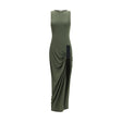 The long fitted Dress by Coperni is a masterpiece of modern elegance, following an elongated line that caresses the body before opening into a softly draped skirt. A suspended tape detail gathers the fabric at the hips, creating controlled tension that guides the fall of the material, accentuating movement. The design is completed by a deep side slit, adding a sensual and dynamic touch. This dress perfectly balances structure and fluidity, making it ideal for elegant occasions that require a mix of sophistication and boldness.