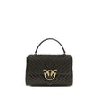 The Calfskin Love Lady Handbag by Pinko, front magnetic button closure, iconic gold-plated and embossed Love Birds logo on front, quilted and padded design, double interior compartment, sliding chain shoulder strap, flat rigid handle at top, interior flat pocket with zipper, iconic tone-on-tone embroidered brand monogram on back.