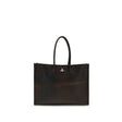 The Troy Tote Bag by Vivienne Westwood, crafted from leather, combines elegance and functionality. Featuring two tubular handles and a rectangular silhouette, it has a hidden magnetic closure, a metal Orb logo on the front, and an internal zip pocket for practical organization of essential items.